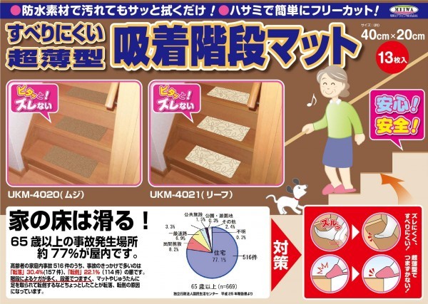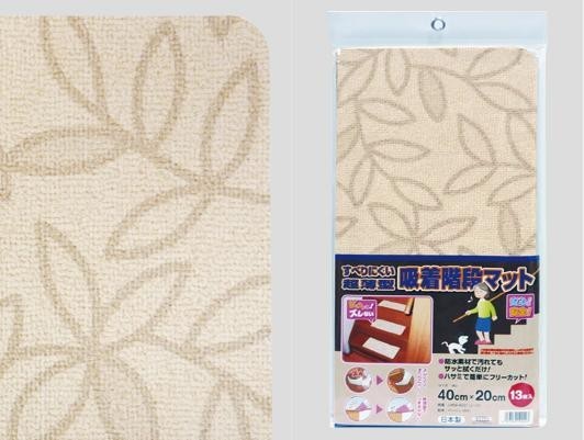 防水素材で汚れてもサッと拭くだけ!超薄型で、廊下敷と床との段差が出来ないので、つまづきがありません。 製造国:日本 素材・材質:本体:塩化ビニル樹脂100%中間層:ポリエステル100%裏面:アクリル樹脂剥離フィルム:ポリプロピレン100% 商品サイズ:40×20cm セット内容:13枚入り ※サプライヤー直送品 ご注文後2~3営業日後の出荷となります【商品名】すべりにくい つまづきにくい 超薄型吸着階段マット13枚入 UKM-4021 ベージュ 40cm×20cm