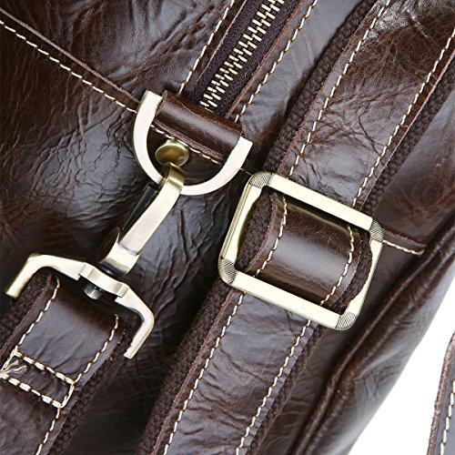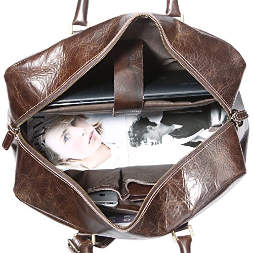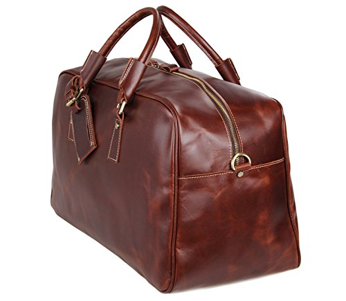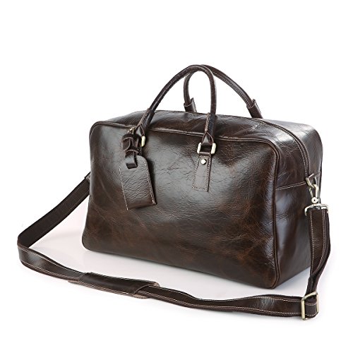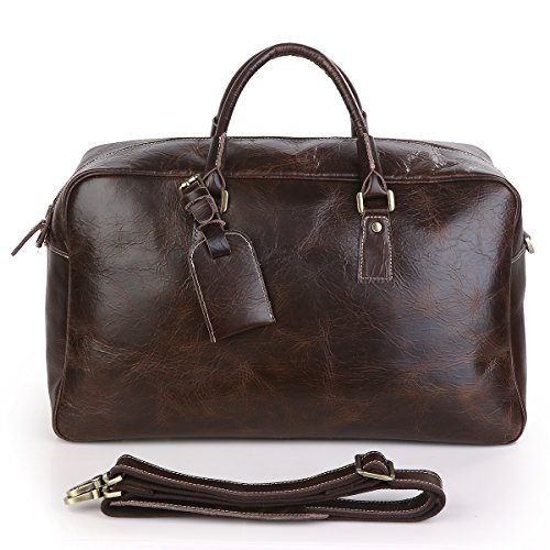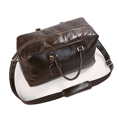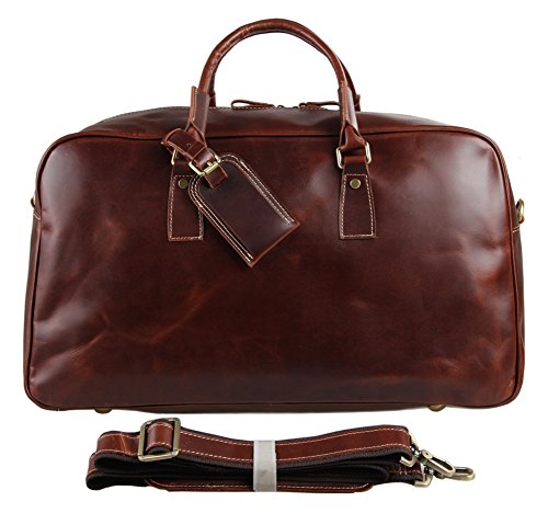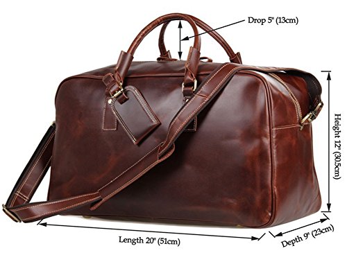 -. Feature : Material: 100% genuine cow leather, top solid brass hardware and bottom studs / Size: 51*23*30.5cm(L*W*H)/20*9*12 inch / With an adjustable, padded and detachable leather shoulder strap, make you carrying comfortable / Spacious compartment to carry your Clothes, Laptop, iPad, Magazines, Books, Travel Items, etc / Premium leather duffel for air travel carry on lage, business trips, overnight or weekend getaways etc