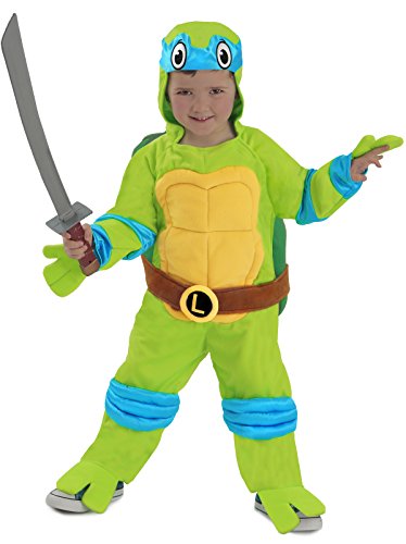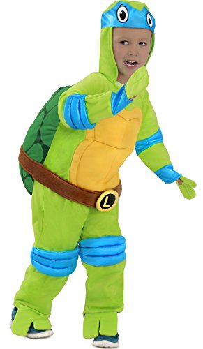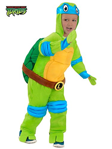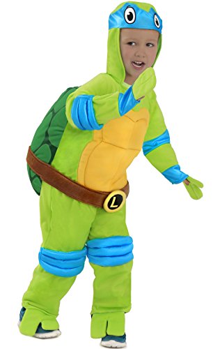 The leader of the turtle brothers needs to dress the part! This one-piece jumpsuit with attached hood is made of light green plush, has a shell of tan/cream plush and dark green plush, and has tricot bands of Leonardo's favorite color: blue.Feature