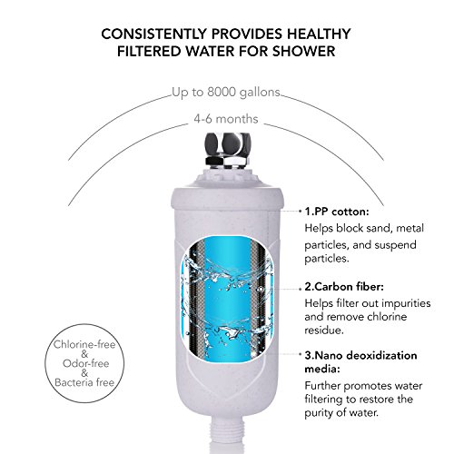 ✔Long Lasting - each disposable shower filter will last up to 4-6 full months, or 8,000 gallons. The filter is 3 stage with PP cotton, activated carbon fiber and nano deoxidization media, your water will be cleaner no matter how hot or cold the temperatures