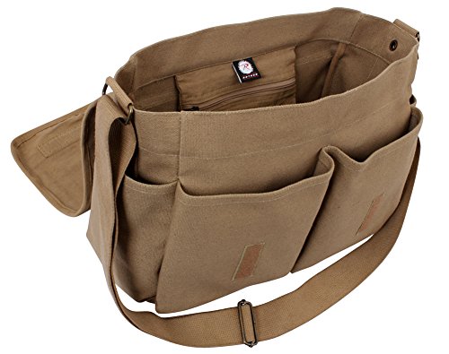 -. Feature : Made From Heavyweight Cotton Canvas / Measures 15" x 11" x 6" / Features Large Main Compartment w/ Zippered Interior Pouch / Dual 7 x 8 1/2" Front Pockets & Snap Close Beverage Side Pouches / 2" Wide Adjustable Shoulder Strap
