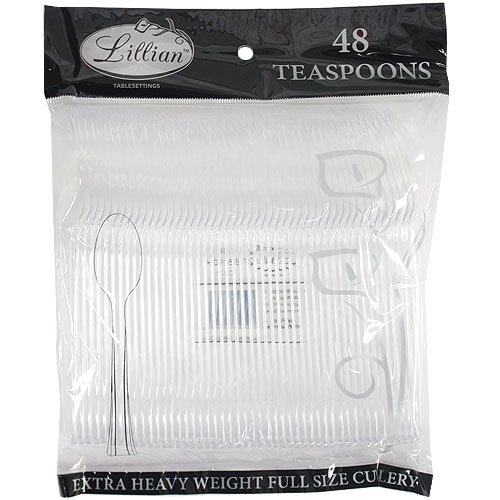 Studio : Lillian Tablesettings Publisher : Lillian Tablesettings Binding : Kitchen Product Description Lillian table settings clear premium plastic teaspoon 48 count. This cutlery can be purchased in matching bagged 48 count separates of fork, teaspoon, soup spoon, knife or 24 count combo. This style cutlery comes in 5 colors: clear, pearl (white), Sahara (off-white), gold and silver. Please view our whole Lillian table settings line for coordinating plates, bowls, napkins, serve ware and drink ware. 0