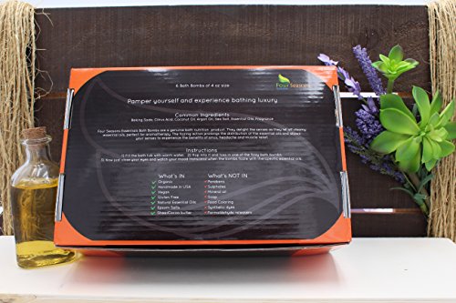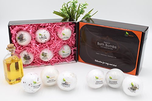 HANDMADE IN USA: Set of 6 generously sized (4 Oz) organic Bath Bombs each with unique fragrance. Carefully curated from ingredients that naturally support the skin and help you feel incredibly relaxed & revived. Each bath bomb is Individually wrapped to uphold freshness and the set is presented in an elegantly designed gift box.