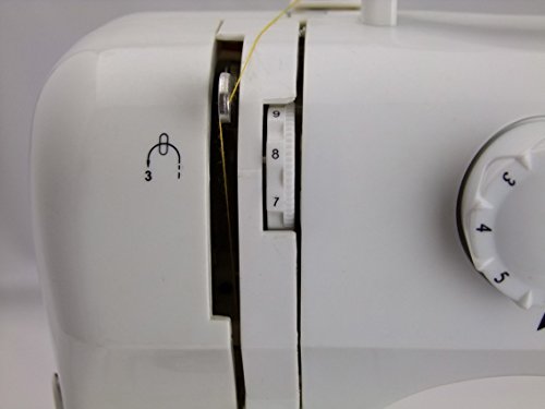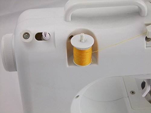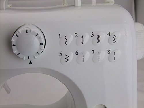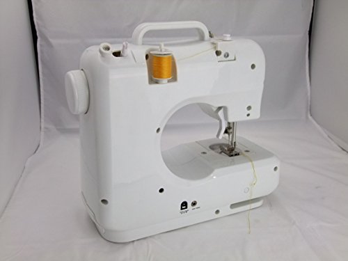 -. Feature : Multi-purpose sewing machine with 8 built-in stitch patterns / Double thread; double speed; forward and reverse sewing / Can sew sleeves; automatic thread rewind; LED sewing light / Includes 2 thread spools, 2 bobbins, needle, threader, foot pedal, and AC adaptor / Measures approximately 10-4/5 by 4-4/5 by 10-1/5 inches