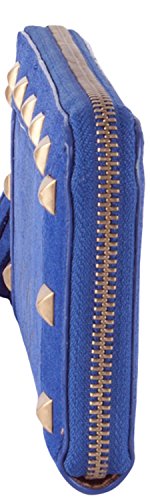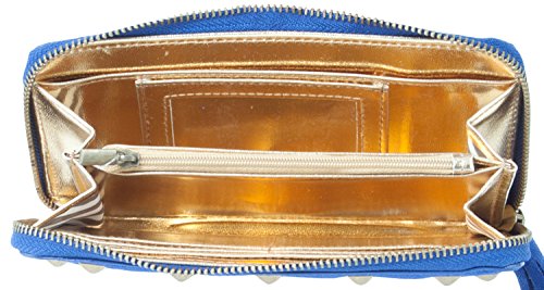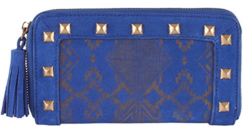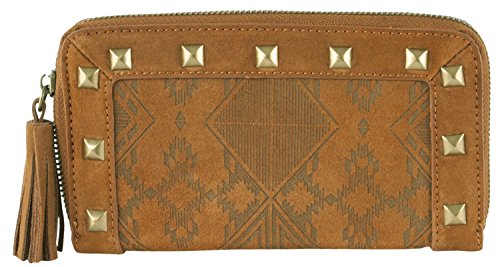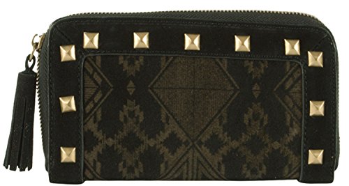 Keep your currency in check with this sleek wallet made of Genuine suede and styled with pyramid studwork and tribal inspired detailing, zip Around closure with fringe pull, Fully lined interior with center zip compartment, Id Slot and 4 card slots, and bill pockets.Feature