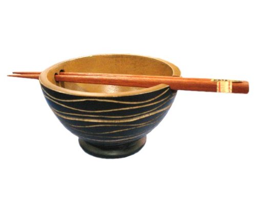 Mango Wood Bowl with Gold Inlay Design and Chopsticks Rest - 4.75" Diameter