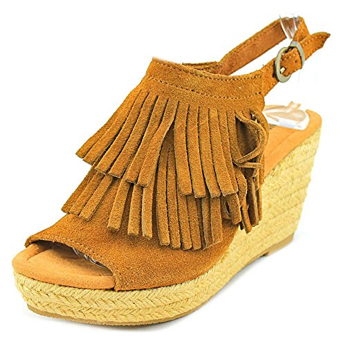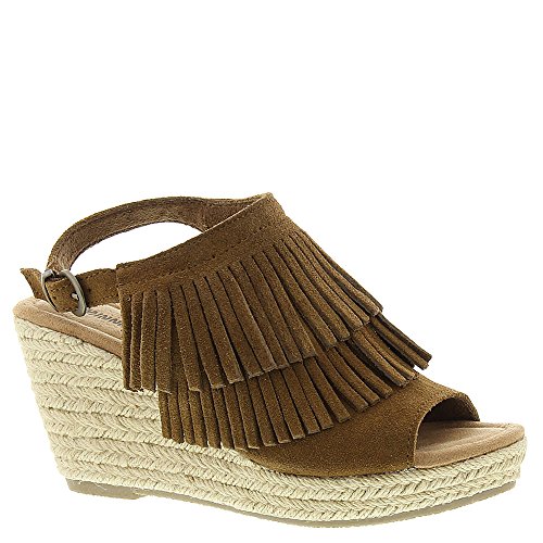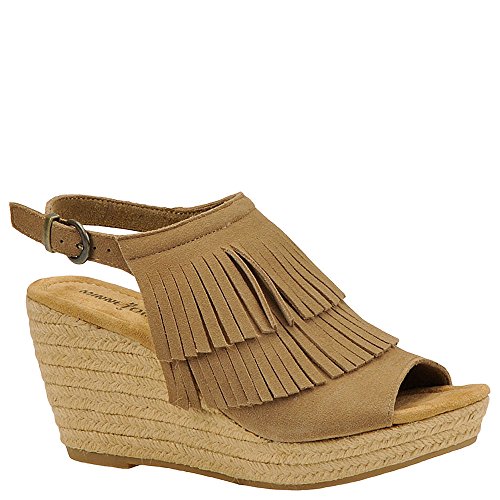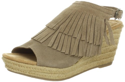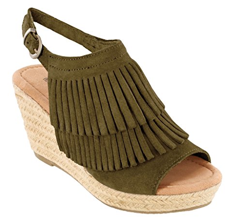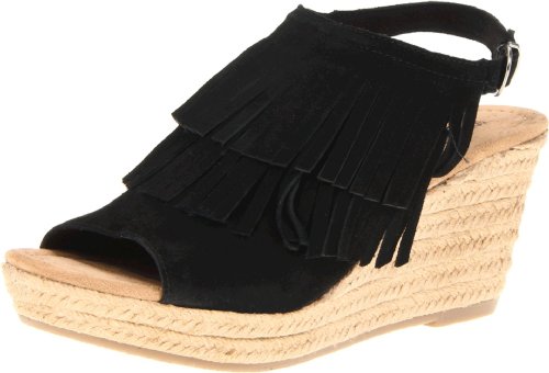 Discover playful summer shoes. These 3 ?-inch jute wrapped wedges topped with two layers of soft suede fringe and buckled ankle straps offer the perfect mix of fashion and function. Ideal for daily strolls or heading to weekend festivals, these womens sandals pair well with everything from cut-off denim shorts to flowy sundresses.