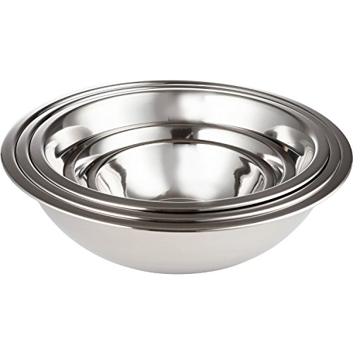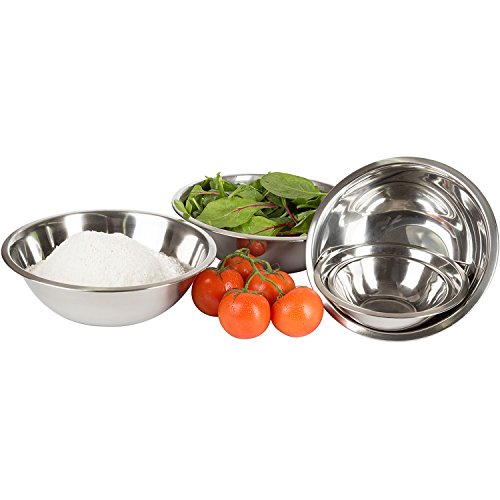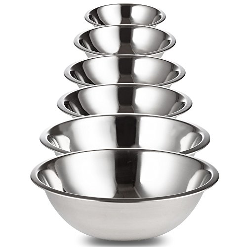 6 SET of COMMERCIAL CULINARY MIXING BOWLS in all the sizes you need for cooking, baking, microwave and more. 3/4, 1.5, 3.0, 4.0, 5.0 and 8.0 quarts. Fashionable and highest quality with 18/8 mirror finish that far out classes your old mixing and mixer bowls. Improvements include bent edges for easier handling and fewer spills. Flat bottoms for best stability for baking bakeware.