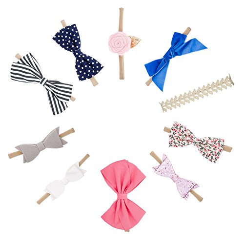 VARIETY OF STYLES - 10 different styles, colors and patterns included to match any outfit. The assortment of beautiful newborn hair bows includes a crown, bowknot, roses, ivory bow, flower and floral patterns, gold lace headband, knotted polka dots, pink and navy bows, solid colors, a felt bow and more!