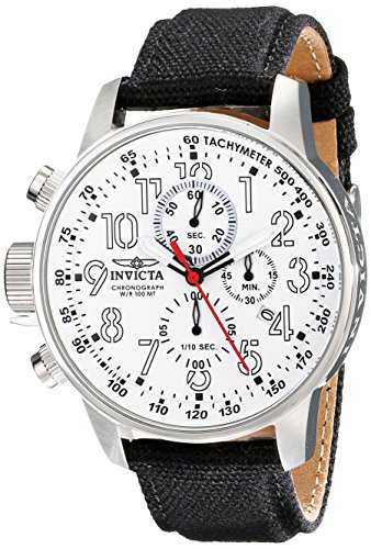 -. Feature : Combine high style and high function with this Invicta watch, featuring a crisp white dial with stencil-like numerals, a stainless steel case, and a sturdy cloth strap with leather backing. / Japanese Quartz movement with analog display / Construction features cloth strap with leather backing, protective mineral crystal dial window, and stainless steel case / Features include luminosity, red second hand, date window at four o'clock position, tachymeter scale on inner bezel, and crown and pushers positioned at 9 o'clock position / Water resistant to 330 feet (100 M): suitable for snorkeling, as well as swimming, but not diving