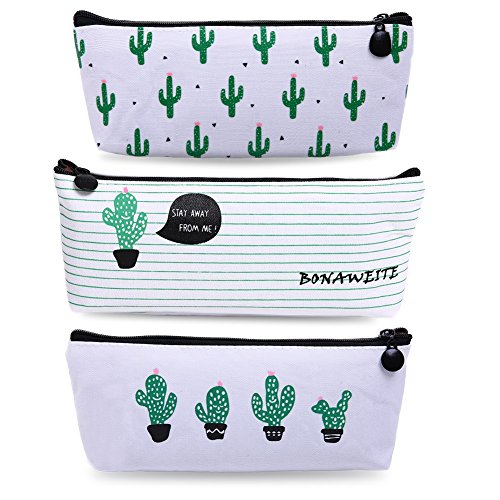Bonaweite Cactus Pencil Bag Linen Pastoral Bandage Case Cute Cacti Pen Zipper Coin Organizer Makeup Cosmetic Pouch Holder for Desk Set of 3