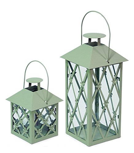 -. Title : Set of 2 Sage Green Decorative Floral Pillar Candle Lanterns