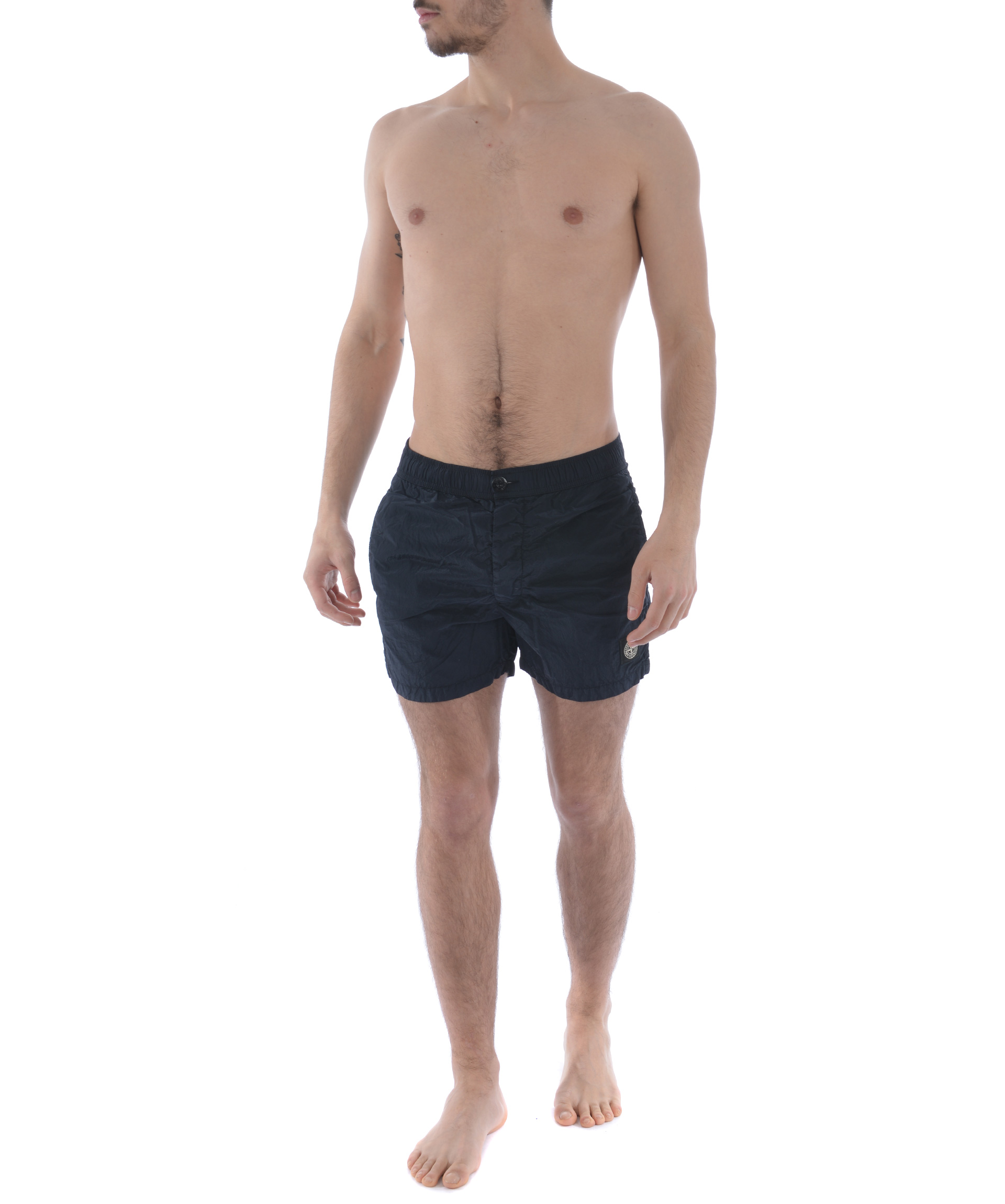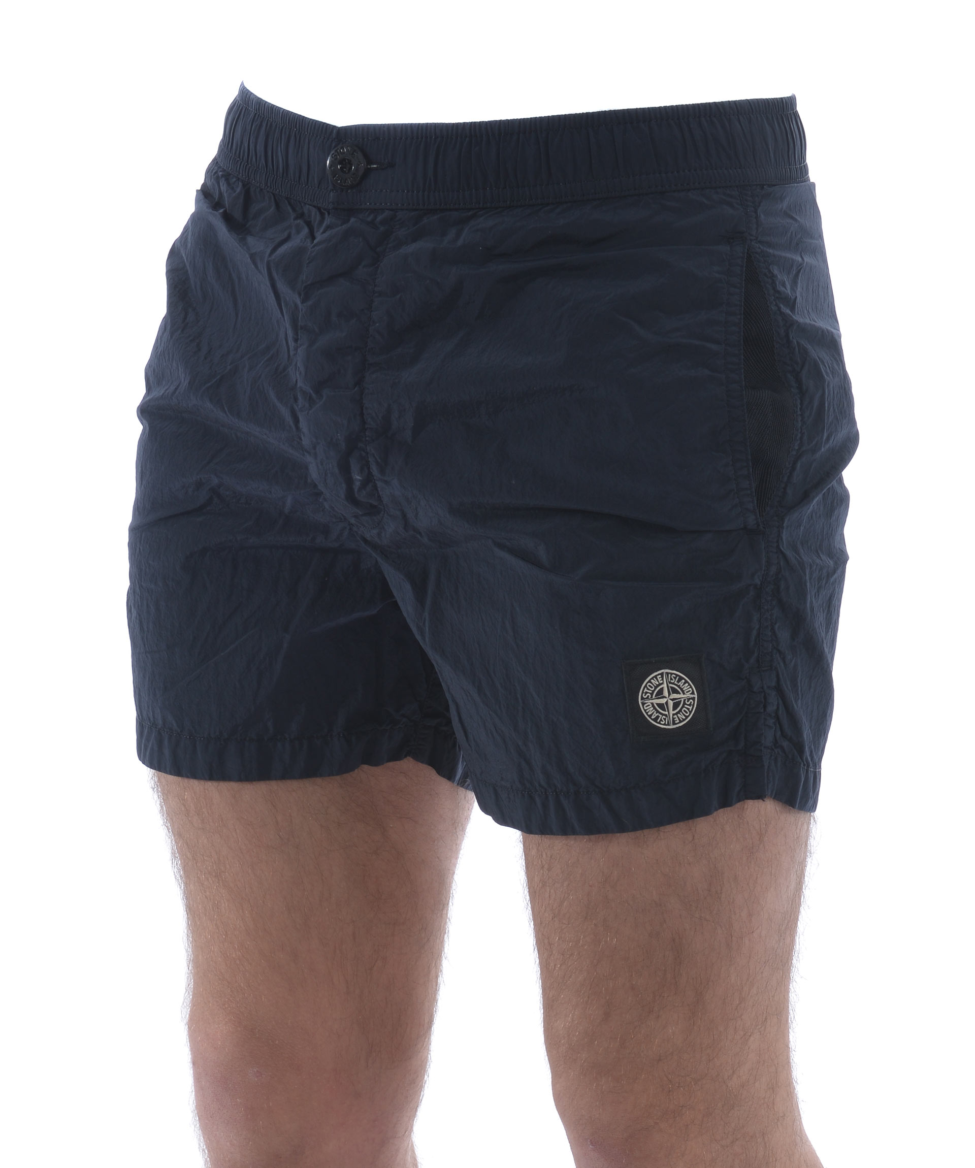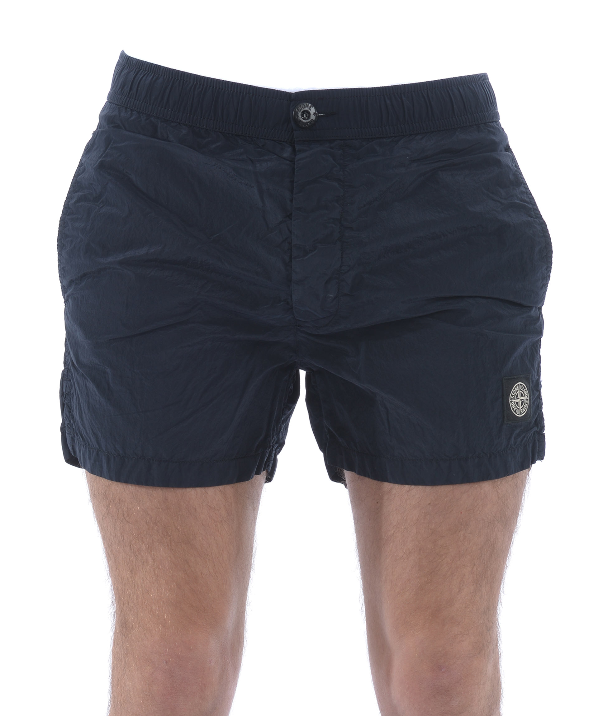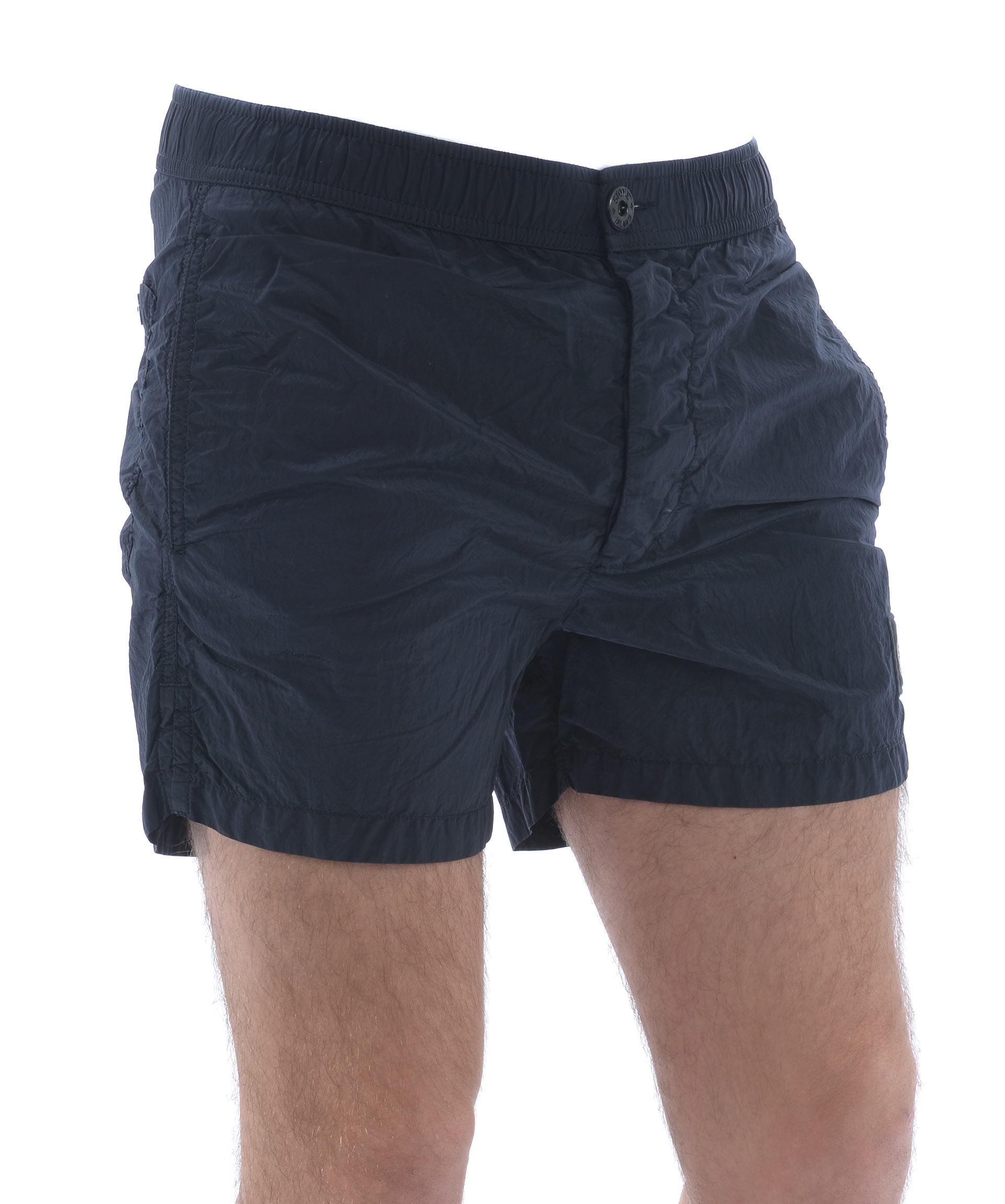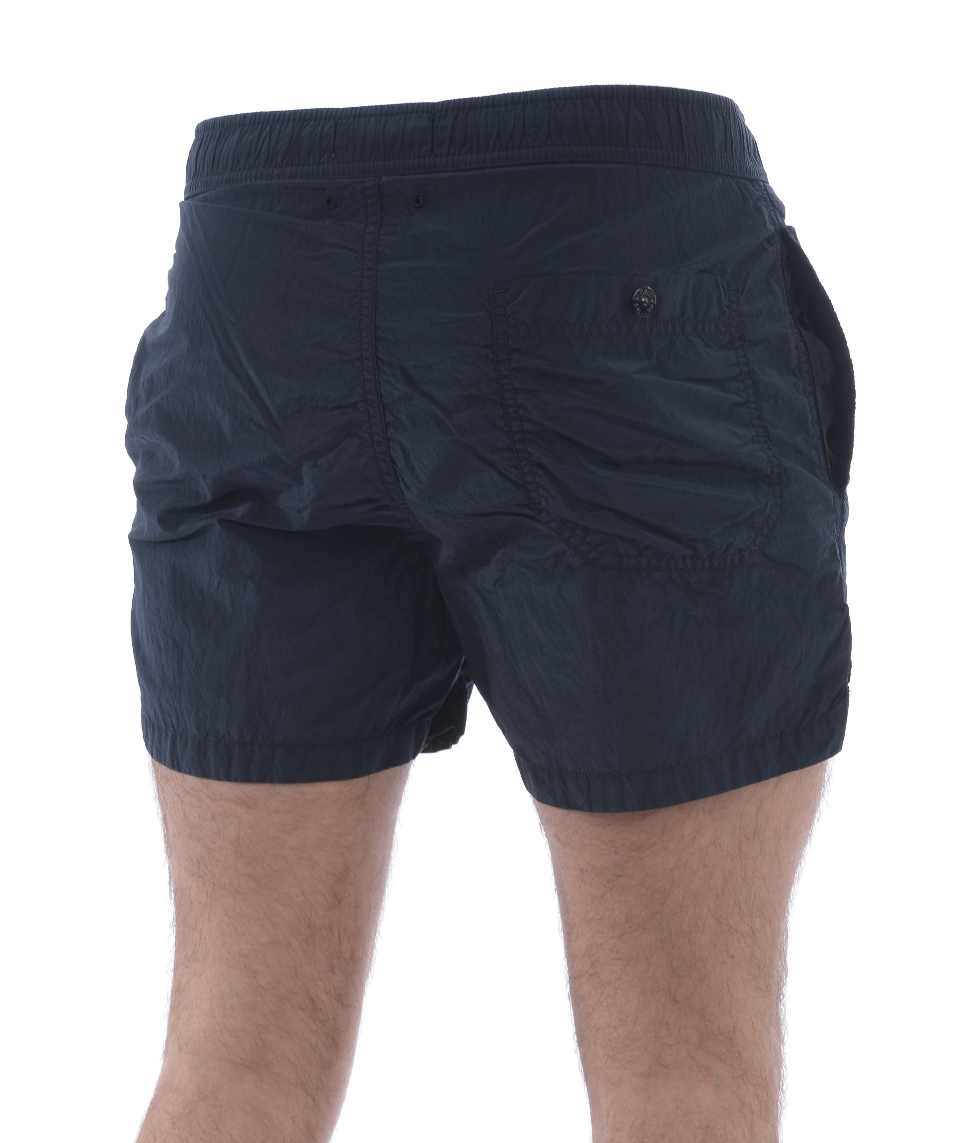 Costume Stone Island in nylon metal Blu scuro effetto cangiante Azzurro. Elastico in vita con coulisse interna e bottoni all'esterno. Tasche frontali a filo. Tasca posteriore con bottone. Spacchetti laterali. Foderato con rete elastica. Logo patch frontale.