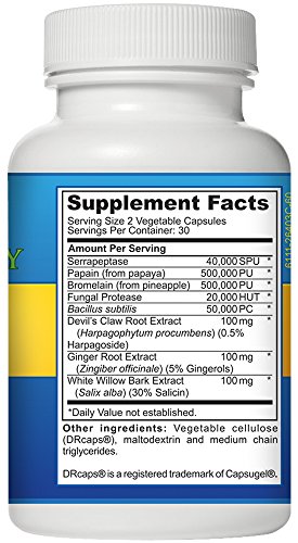 -. Feature : DIMINISH JOINT AND MUSCLE STIFFNESS AND TENDERNESS NATURALLY without over the counter pain relievers. Helps alleviate exercise or overuse induced discomfort and pain anywhere in your body - including lower back pain, hip pain, joint pain, neck pain, shoulder pain, knee pain, wrist pain, foot pain, shoulder pain, shin splints,tension headaches, fibromyalgia, carpal tunnel syndrome & more! Relief may be felt in hours, although best results are typically achieved with two-three weeks of regular use. / POWERFUL EFFECTIVE INGREDIENTS Standardized extracts of herbs traditionally used to diminish the effects of overexertion and injury and aid flexibility, including Devil's Claw Extract (0.5% Harpagoside), Ginger Root Extract (5% Gingerols) and White Willow Bark Extract (30% Salicin). Fungal Protease, Bromelain and Papain are Proteolytic enzymes that help metabolize damged proteins associated with overexertion. Serrapeptase is used for a large variety of painful conditions. / PATENTED DELIVERY TECHNOLOGY- Each bottle contains 60 Vegetable capsules utilizing DRCaps®, which have Kosher and Vegetarian Society certifications. DRcaps® capsules are formulated to help protect the Enze-Ease ingredients and bypass stomach acid, helping to ensure that the NON-GMO ingredients are delivered where they will do the most good. / MANUFACTURED IN THE USA WITH THE HIGHEST STANDARDS to ensure its superior quality and top-line performance. Designed and tested to meet the most stringent quality control and exceed your highest expectations! / 100% Satisfaction Guarantee