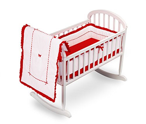 ReleaseDate : 2015-11-04 Studio : Baby Doll Bedding Publisher : Baby Doll Bedding Binding : Baby Product Product Description Adorn your baby's cradle with this unique cradle bedding set. This solid white poly cotton set includes a comforter, bumper and fitted sheet that fits an 18" x 23" cradle. This set is edged with a red ruffle and has unique lace with red trimming and ribbon pulled through. Fully manufactured in the USA. 0