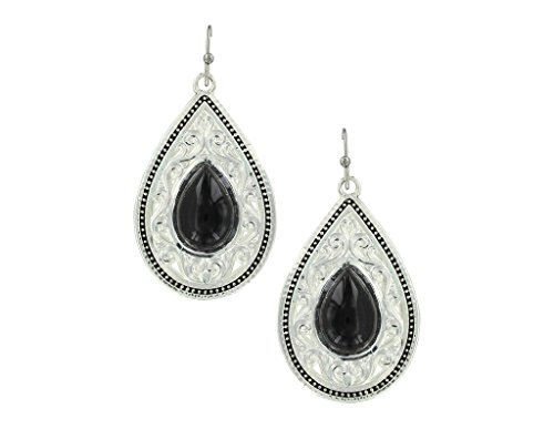 A silver finished teardrop with open filigree work scrolling along the middle and around a deep black onyx teardrop stone. An edge of smooth bright silver runs along the outermost edge of the earring with a line of tiny silver finished microbeads against hand painted black background. Earrings dangle on hypoallergenic French hooks.
