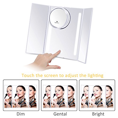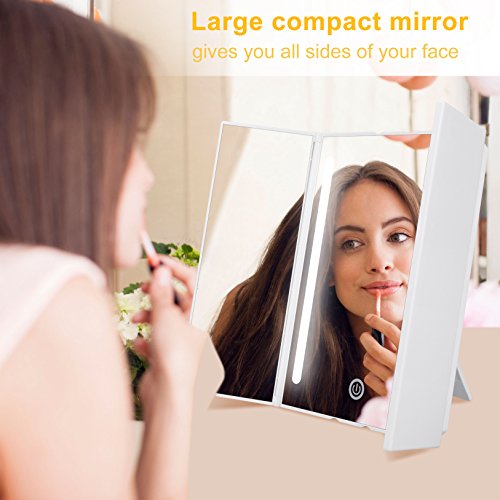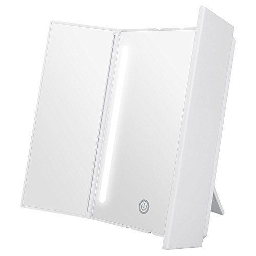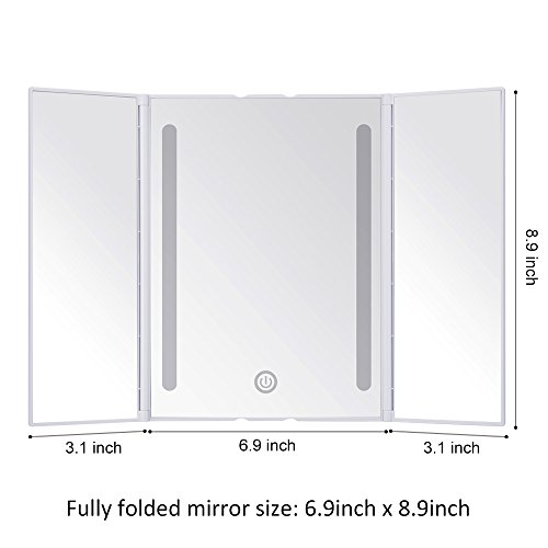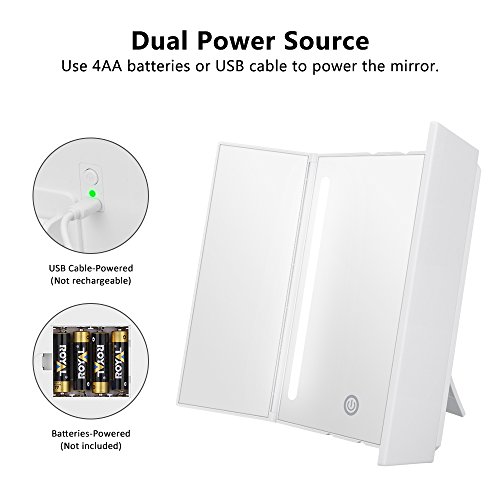 Do you want a wonderful makeup experience? KEDSUM Tri-fold LED Light Makeup Mirror helps you! Coming with a with 13.2"X 8.9" Large View Screen when fully opened ,KEDSUM Tri-fold LED Light makeup mirror gives you a perfect view of your face, which is operated by 4 AA batteries (Not included) or USB cable (not rechargeable). It provides the natural daylight and you can adjust the brightness through touch screen sensor switch as you like. What's more,180°adjustable bracket allows you to adjust the mirror to the viewing angle as you like to set on the desk or hang on the wall. The compact design with 6.9"X 8.9" size when fully folded is perfect for the avid traveler or businessperson.