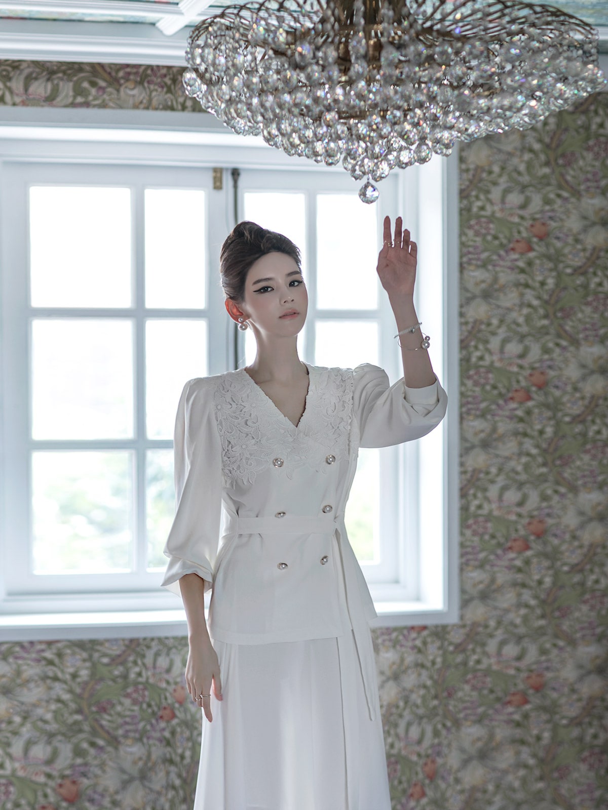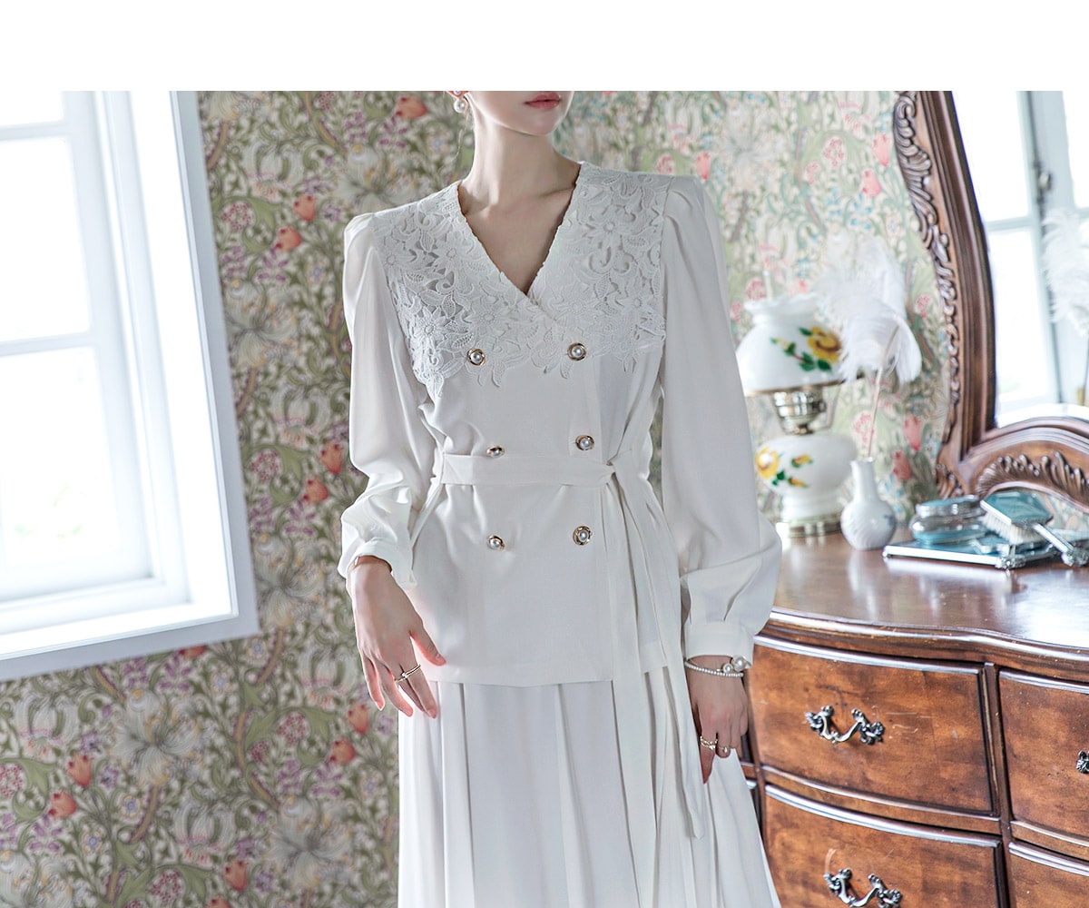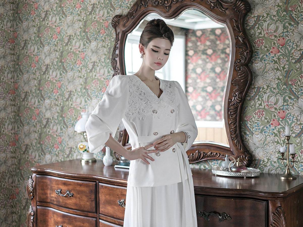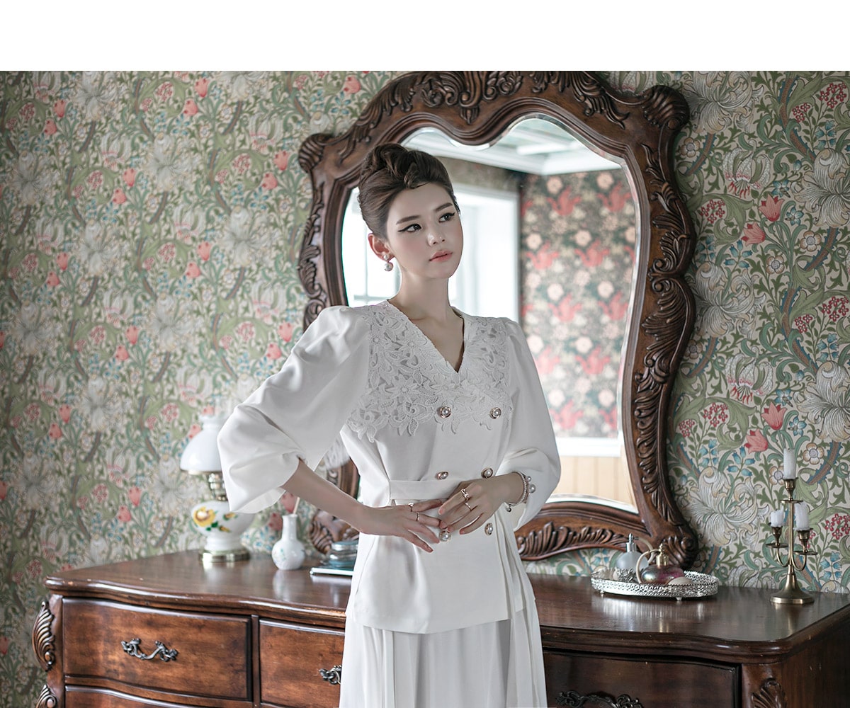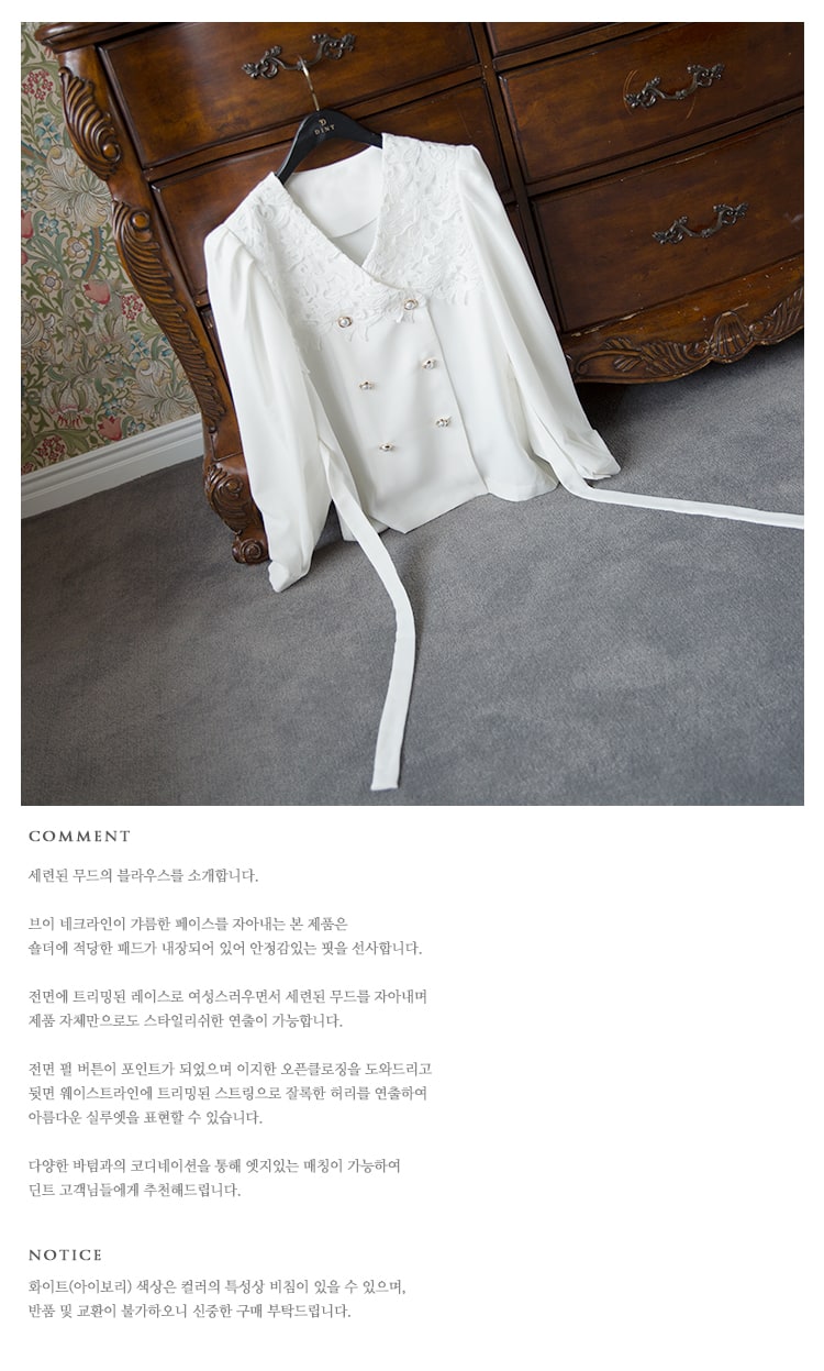 B2300 레이스 더블 펄 버튼 블라우스 Ivory