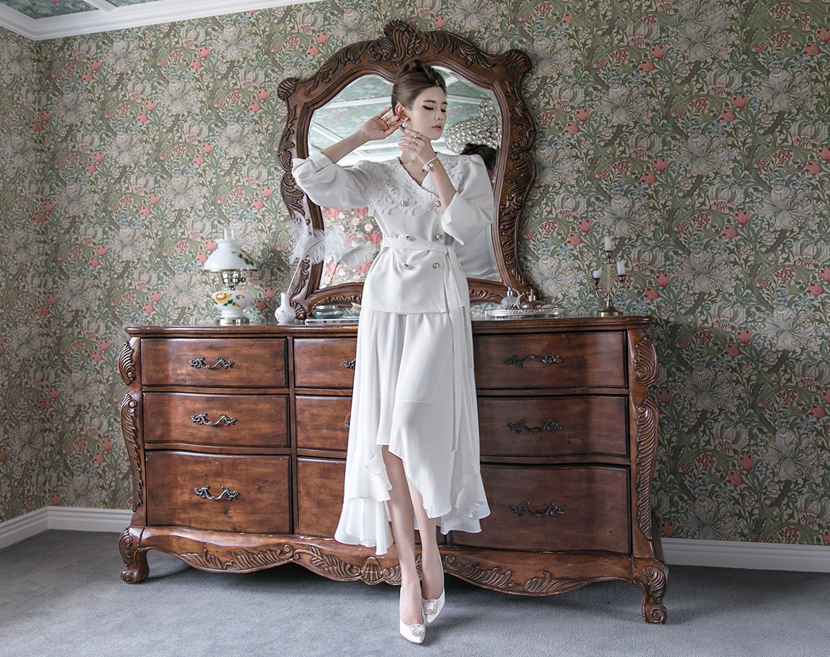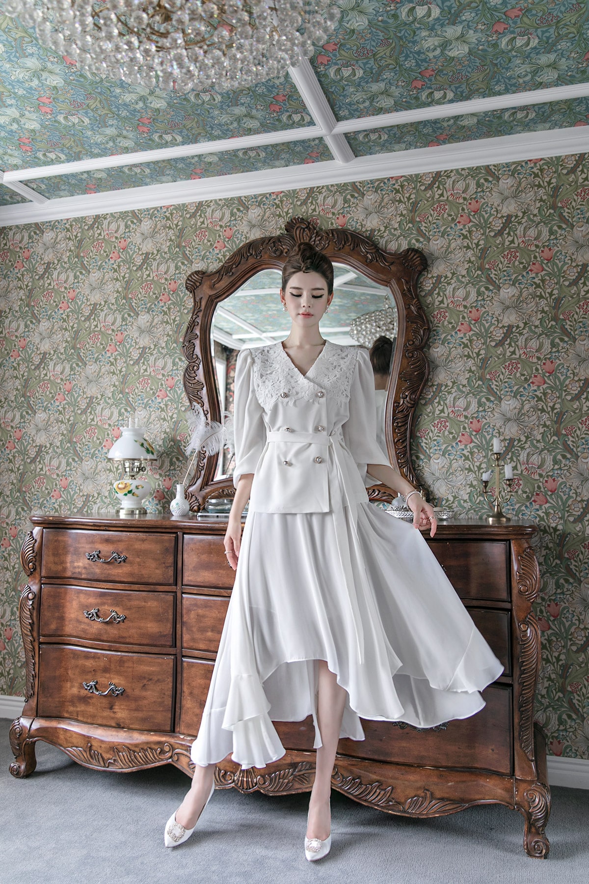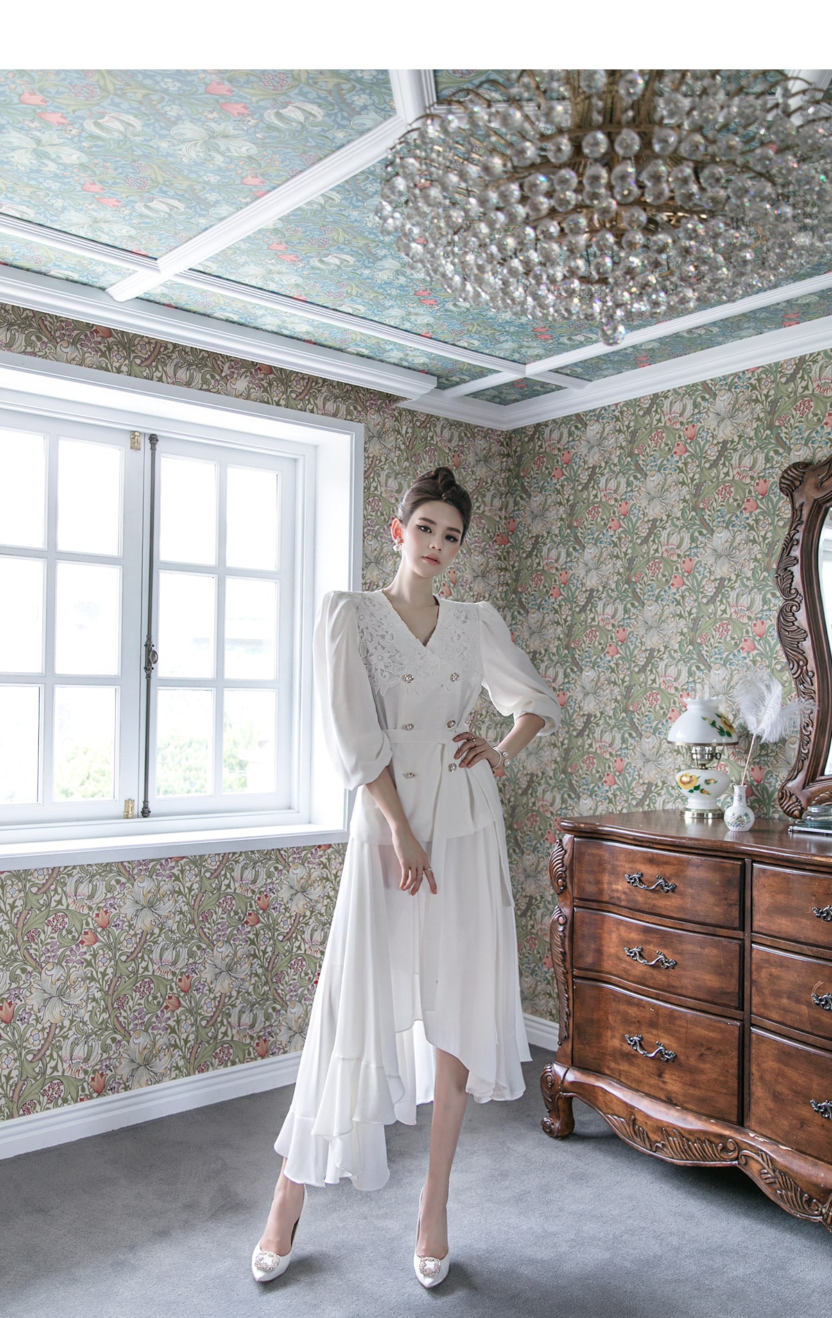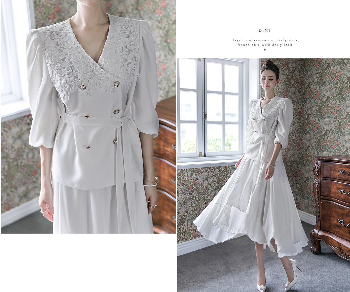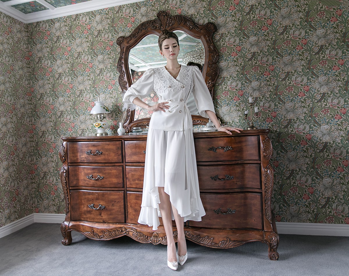 B2300 레이스 더블 펄 버튼 블라우스 Ivory