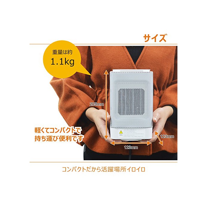 【콤팩트&절전 에코】사이즈:123*123*205mm.중량:1.25kg.콤팩트 사이즈 또한 심플 디자인이므로 두는 곳소로도 곤란하지 않아 사용 하실 수 있습니다.탈의장이나 현관,화장실,부엌 등 커다란 난방기구가 쓰이지 않는 장소로《빗타리》입니다!정음과 무취 설계를 탑재하고, 오피스에 업무중의 샐러리맨과 공부중의 아이도 권장입니다.연소 하지 않고에 덥게 하고, 공기에 더럽히지 않습니다.