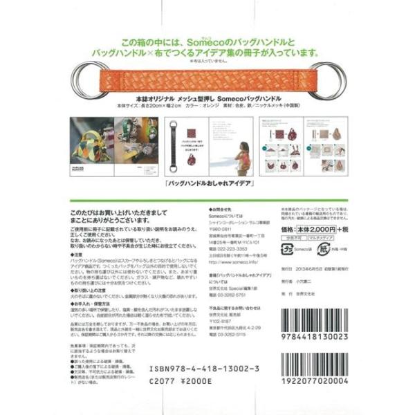 【商品説明】 定価(税込み):2,160円 値引き:10% OFF お気に入りのスカーフやふろしきがバッグに変わる!巷で人気「SOMECO」のバッグハンドルとスタイルブックがセットに! バーゲンブック 新品 特価 格安 ハンド クラフト 洋裁 人気 ブック バッグ |