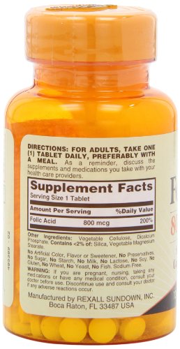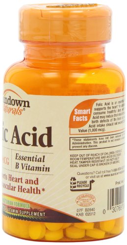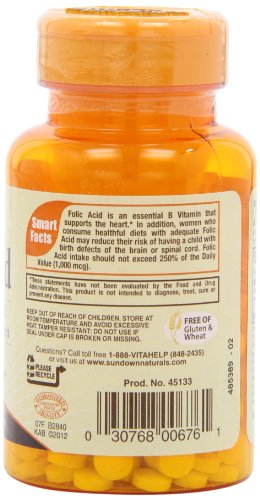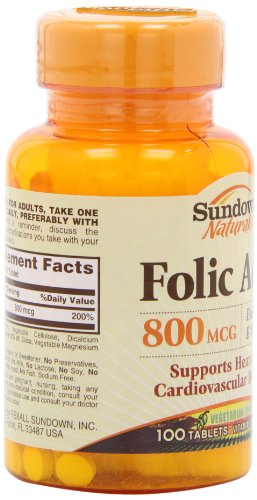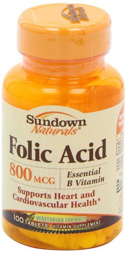 -. Binding : Health and Beauty -. Brand : Sundown Naturals -. EAN : 0030768006761 -. Feature : 100% free of gluten & wheat, dairy & lactose, artificial flavors / Supports heart and cardiovascular health.* / Important for pregnant women.* / One tablet a day. / *These statements have not been evaluated by the Food and Drug Administration. This product is not intended to diagnose, treat, cure or prevent any disease. -. Label : NBTY.inc - US Nutrition,inc. -. Manufacturer : NBTY.inc - US Nutrition,inc. -. NumberOfItems : 3 -. PackageQuantity : 3 -. ProductGroup : Health and Beauty -. ProductTypeName : HEALTH_PERSONAL_CARE -. Publisher : NBTY.inc - US Nutrition,inc. -. ReleaseDate : 2015-06-12 -. Studio : NBTY.inc - US Nutrition,inc. -. Title : Sundown Naturals Folic Acid 800 mcg, 100 Tablets (Pack of 3) -. UPC : 030768006761