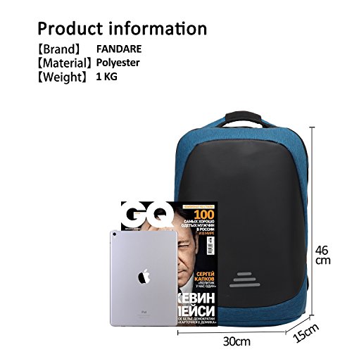 PRODUCT INFORMATION:? ---3D breathable back fabric. ---This backpack has a classic appearance of the shape. ---The top has a sturdy handle for lifting, grabbing, carrying, and hanging. ---This backpack uses high-density materials and excellent sewing technology, making the bag more durable. ---Soft breathable mesh for extra comfort and stability. The laptop back is breathable and doesn't hug the bag. This prevents intense sweating on the back. ---The length of the shoulder strap is adjustable. Ergonomic design with S-shaped shoulder straps, which completely fit your back to feel the ultimate comfort.? ---This laptop backpack is shockproof design with the laptop compartment padded with the thick foams to help reduce the damage of dropping and striking. ---This backpack has a lot of pockets , it can be a good ?protection of your items.This bag makes full use of the space, it is the best choice for laptop. ---External USB with built-in charging cable offers a convenient charging of your electronic device anywhere. Designed for either Micro-USB or Apple products. ---NIGHT SAFETY BACKPACK - There is a retro reflective tape on the front of the bag which makes this backpack more conspicuous in the night. This is a safe backpack for you to walk in the night. ABOUT FANDARE: FANDARE, a United Kingdom fashion brand of backpack, founded by United Kingdom fashion designer Saunders in 1982. FANDARE is famous for its fashion and simple design concept.? Our products include backpack, travel bag, sports bag, school bag, laptop bag, mountaineering bag, purse, sling bag, briefcase, messenger bag, crossbody bag, wallet etc. Our products have been exported to more than 30 countries and regions like: Europe, the Americas, and Asia etc. 0 |