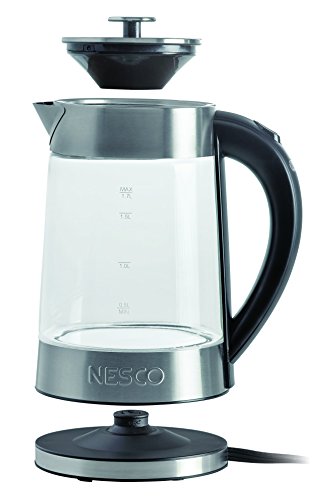Quickly boil water to make instant coffee, tea, hot chocolate and more with the 1.8-quart Nesco Electric Glass Water Kettle. Uses about half the energy of a stovetop and boils faster than most microwaves. Perfect for kitchens, dorm rooms, offices and RVs to use for instant soups, oatmeal, hot cereals, ramen noodles, boxed mac & cheese, gelatin and rice. Featuring a removable lid for easier filling and cleaning that locks with the push of a button to stay securely in place while pouring. This water kettle has a 360-degree swivel power base with a cordless glass pitcher, cord storage, power indicator light and auto shut-off protection for safety. UL-Certified. 1500 watt.