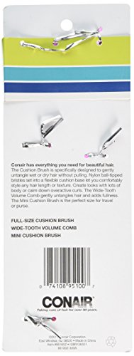 -. Feature : Cushion base brushes for stress free styling / Nylon ball tipped brush bristles will not snag or pull / Large tooth comb gently detangles wet or dry hair / Oval brush heads for brushing and styling hair of all lengths and textures / Pop in purse, makeup bag or travel tote for touchups on the go