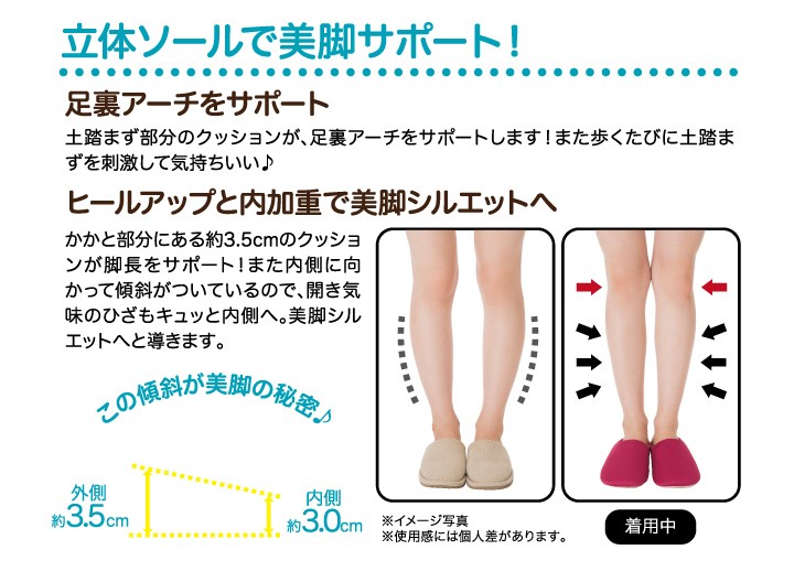 | ご使用上のご注意 | ●本品は室内用です。屋外では使用しないでください。 ●痛みを感じた場合はご使用を中止してください。 ●転倒するおそれがありますので本品をはいたまま走らないでください。 ●慢性の疾患のある方はご使用前に医師にご相談ください。 ●使い始めは様子を見ながら短時間のご使用から始めてください。 ●初めて使用する際は、軽い違和感や痛み等を感じる場合がありますので、適度な着脱を繰り返してください。 ●妊娠中の方や妊娠の可能性のある方はご使用しないでください。 ●濡れた場所やすべりやすい場所でご使用される場合は十分にご注意ください。 ●使用感には個人差があります。 ●開封後は、材質特有のニオイがする場合があります。ニオイが気になる場合は、陰干ししてからご使用ください。 ●洗濯機の手洗いコースでの洗濯はお避けください。 ●乳幼児の手の届かない場所に保管してください。 ●火気のそばや高温多湿な場所、直射日光の当たる場所には保管しないでください。 ●本来の目的以外でのご使用はおやめください。 |