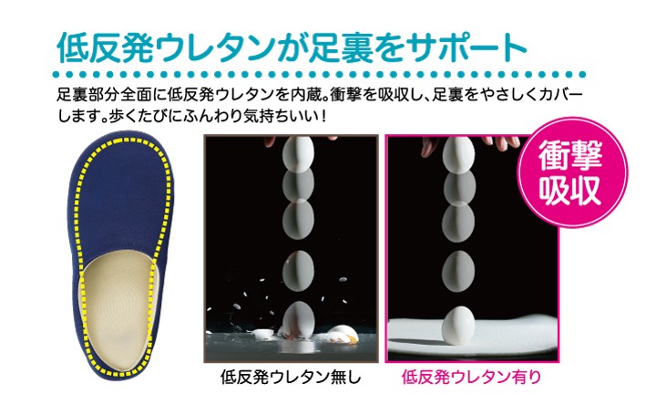 | 材質 | 本体・底生地:ポリエステル100% 中材・土踏まず部クッション:ポリエチレン 中敷クッション:ポリウレタン すべり止め:合成皮革 |