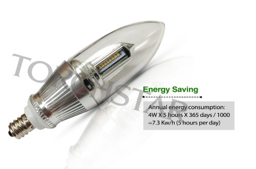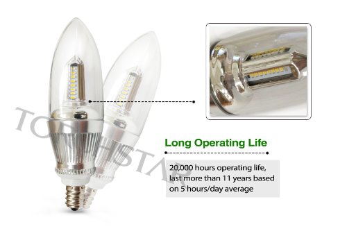 - Feature : 20,000 hours operating life, last more than 11 years based on 5 hours/day average / Annual energy consumption: 4W X 5 hours X 365 days / 1000=7.3 Kw/h / 4W LED equivalent to 40W incandescent candle light, perfect replacement and save on electric bill / Soft warm white halogen-like LED light, no dazzle light to the eye / High quality Aviation Alumina lamp body, Nickel finished lamp base
