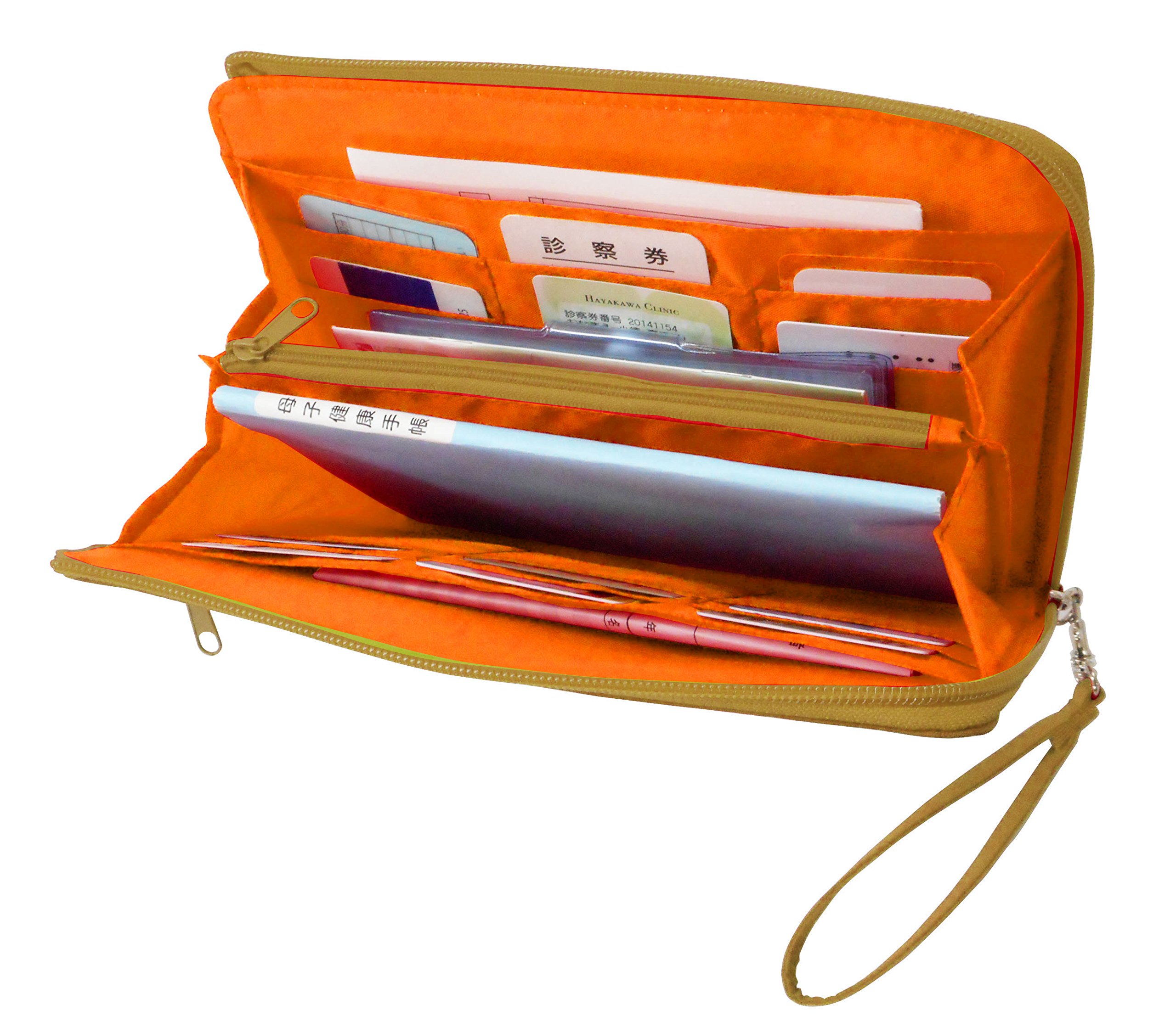 It is fastener type easy to open and close with mother and child handbook as well as 12 cards in front of and behind the card pocket for entering insurance cards and examination tickets, 2 rooms in front and back of the open pocket, and if you put them together in fastener pocket that does not jump out of it, when you go out