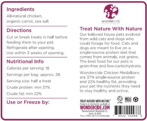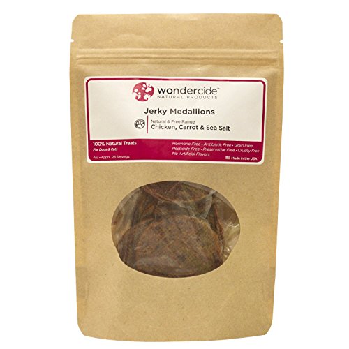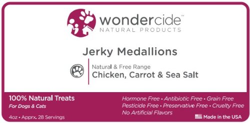 -. Feature : Wondercide's Chicken Jerky Medallions contain only all-natural chicken, organic carrots, and sea salt. That's it! / The chicken we use is free-range, hormone-free, antibiotic-free, fed a vegetarian diet, and humanely raised. / These treats are made like all Wondercide products - by hand, in small batches, with lots of love and care in the USA! / Our treats contain real meat from the same supplier Whole Foods uses. / Cats and dogs of all ages will love these treats!