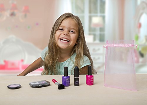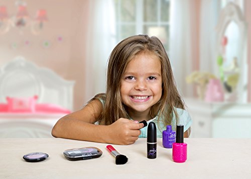 Set comes with Pink and Purple Nail polish. Silver and Pink Glitter Eye Shadow. Pink blush compact. Red Lipstick (goes up and down like real lip stick).