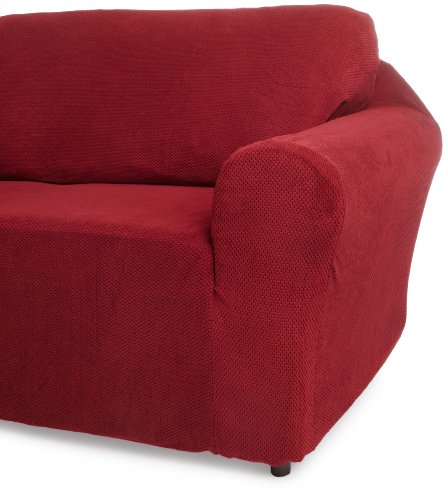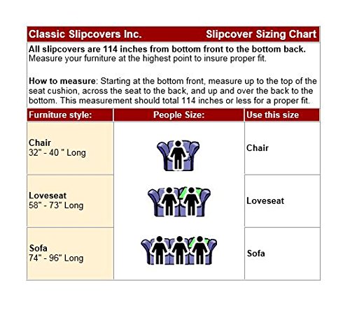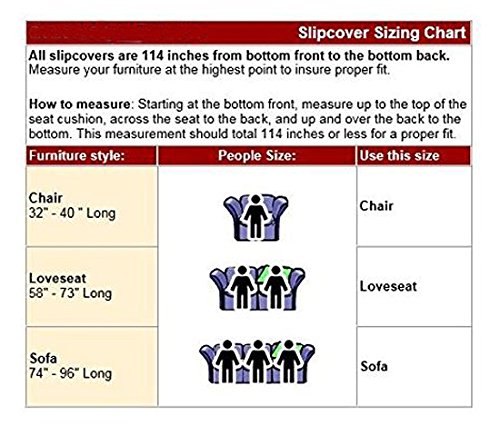 -. Feature : Fits most upholstered furniture including round arm, square arm, and sweep arm shaped furniture, not recommended for colonial or wing pieces / Easy care, machine washable, cool water, no chlorine bleach, machine dryable at a cool setting / Color fast and will not fade even with repeated home launderings, when instructions are followed / Matching decorative pillows are available as well as other sizes of covers (chairs, loveseat, sofa) to complete your decorating scheme / Elastic drawstring encompassing the entire cover helps keep the one piece slipcover in place