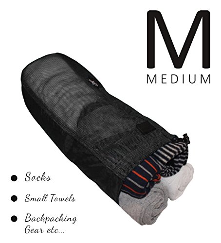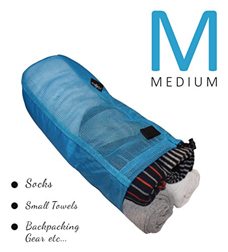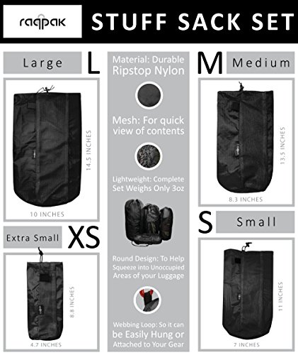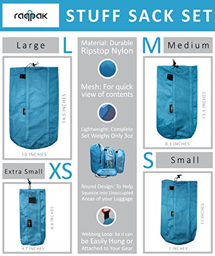 -. Brand : Raqpak -. Feature : Finally! Ultralight Stuff Bags so now you can easily organize your Vacation or Camping equipment, small Gym or Exercise Gear in separate bags! / Perfect complement to your Packing Cubes or Biking Gear with a rounded shape that fits multiple accessories and stores easily inside larger packs. / Mesh Siding allows quick view of items and is ideal for keeping wet clothes dry from the beach or playing sports. Made from durable Ripstop Nylon to endure the elements and resist tears. / Getting on a Flight or going on a Cruise? These unique drawstring travel bags weigh only 3 ounces, so no extra weight to carry on! / These unique ditty sacks come in 3 vibrant colors: Black, Light Blue and Green and in 4 separate sizes: L (10"x14.5"), M (8.3"x13.5"), S (7"x11") and XS (4.7"x8.8") -. PackageQuantity : 4 -. ProductGroup : Apparel -. ProductTypeName : LAGE -. Title : Raqpak Stuff Sack Set of 4 Lightweight Travel Drawstring Bags for Lage and Backpacking Outdoors