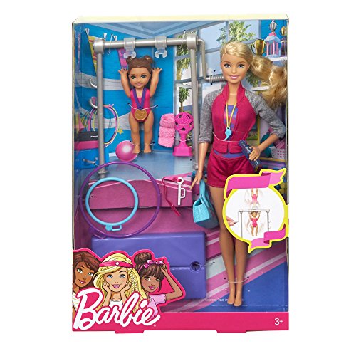 -. Feature : Play to win with Barbie dolls and sport-themed playsets that have fun working features for active play! / The Barbie gymnast instructor set includes Barbie doll as a gymnastics coach, a student gymnast doll, a spinning bar and sport accessories that let young athletes practice and perform / Raise the bar for fun by attaching the gymnast student doll's hands to the clips on the silvery bar; then turn the crank to see her perform amazing spins / Use the two different sized hula hoops to work on the student's mat skills. Enjoy a break with a water bottle, towel and sports bag. Experience the thrill of competition with a trophy and medal to reward excellence / Barbie coach doll wears a graphic leotard, sport jacket, shorts and whistle in vibrant colors; her student matches with a pink leotard