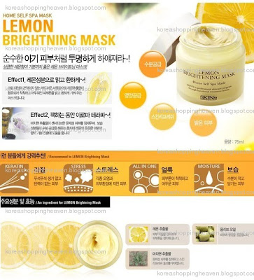 SKIN79 Lemon Brightening Mask - Home Self Spa Mask SKIN79 is a professional skin care program through functional treatment system. The mask is effective to such skin as needing management of brightness with Lemon extract helping dark complexion radiant and bright. Natural moisturizing ingredients are lightly and softly absorbed in skin without irritation. The Hyaluronic Acid keeps your dry skin clear and healthy by supplying soothing and moisturizing effect. Directions : After cleansing, apply a thick layer of mask to the skin, avoiding eye and lip area. Rinse thoroughly after 10-15 minutes with lukewarm water. Use it once or twice a week. Skin79 lemon brightening mask 75ml selling at $22.90 inclusive of normal local delivery. PLEASE CONTACT US AT KOREASHOPPINGHEAVEN@GMAIL.COM FOR MORE DETAILS OR FOR OTHER SKIN79 PRODUCTS. THANK YOU
