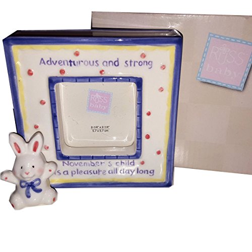 -. Feature : Frame Reads: Adventurous and strong November's child is a pleasure all day long / Painted In Purple & Yellow Trim and Has 3D White Bunny / Cute Porcelain Frame by Russ Berrie & Co / Holds 2 1/4" x 2 1/4" Photo