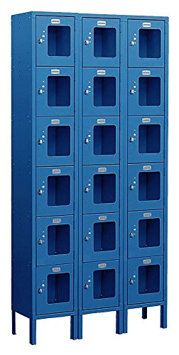 Salisbury S-66000 Series Six Tier Box Style See-Through Metal Lockers are ideal for industry, retail, offices and recreational facilities where a view of the locker contents is necessary. Constructed of 16 gauge steel with a polycarbonate see-through door panel that provides maximum visibility. Available as unassembled or assembled (additional charge for assembled). Feature a durable powder coated finish available in gray, tan or blue. Available in 6 foot height (add 6" for legs). Units have compartment sizes that are 12" wide, 12" high and 12", 15" or 18" deep. Available as 1 wide or 3 wide units. Salisbury Industries is an ISO 9001: 2008 certified company and has excelled in the field of manufacturing since 1936.Feature