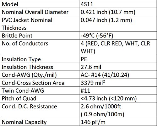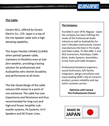 Canare 4S11, 14 AWG (11 AWG when paired) Star-Quad (eliminates EMI noise), High damping, Ultra-flexible cable is a top of the line solution for super-durable (flexible even at 0°F) speaker cables. Low Capacitance & Resistance are ideal for long cable runs.