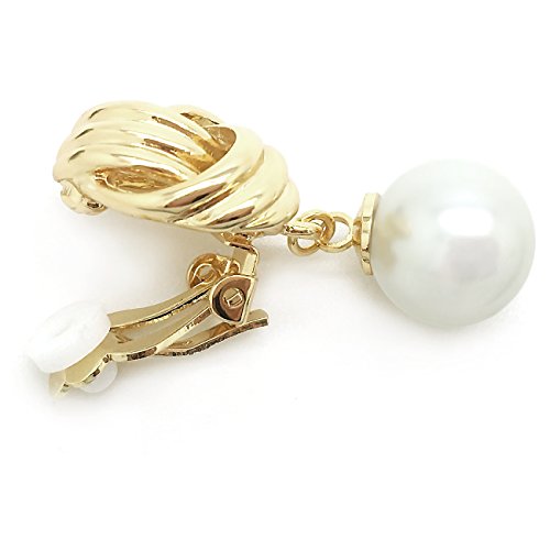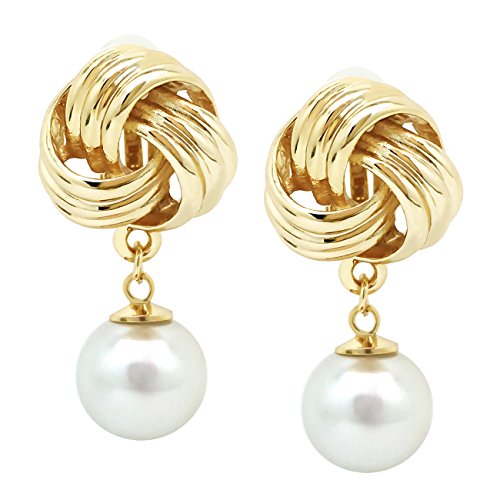 These dangle clip on earrings are made of gold plated alloy with polished finish. Featuring love knot design accented with simulated pearl. Perfect for casual day or fancy party wear. For non-pierced ears. Just clip and you are ready to go. These fashion clip on earrings will make the perfect choice for your special someone for Valentine's gift, Christmas gift, Mothers day gift, Birthday gift, Anniversary Gift, or Bridal party gifts.Feature