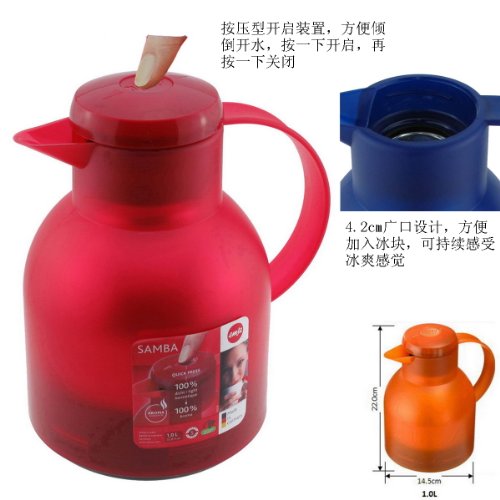 Studio : Emsa Publisher : Emsa Binding : Kitchen Product Description Emsa was founded in Germany over 60 years ago and has been a leading German manufacturer of kitchen and home accessories since that time. Countless design awards are evidence why consumers and professionals in more than 140 countries trust the Emsa name. The samba quick press insulated server from Emsa has superior heat/cold retention for up to 10/16 hours. Samba features a convenient press-button closure for effortless pouring. When the button is flush with the lid, the unit is closed and 100% leak-proof. Press the button down and the unit is open, ready to pour. Press again to close. 34-Fluid ounce capacity. A superior insulated container you can depend on to keep your beverages hotter, colder and fresher longer. Hand wash recommended. 0
