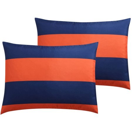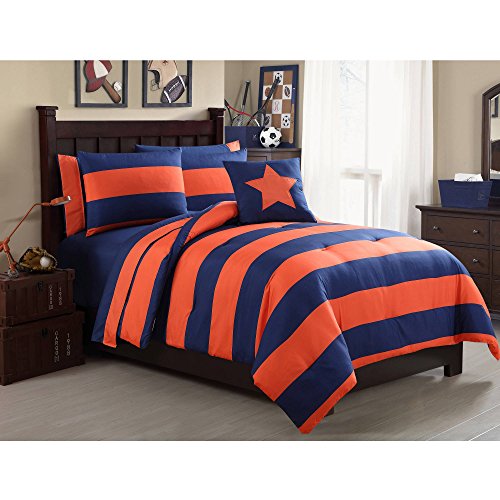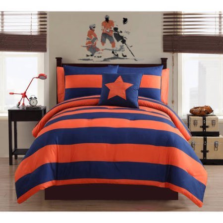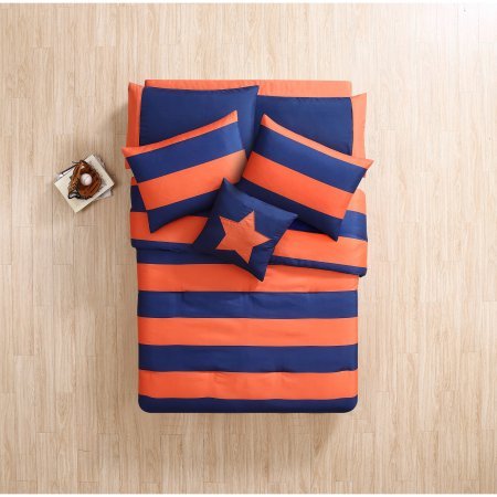 Product Description Add a modern touch to your bedroom with the Mainstays Rugby Stripe 6/8-Piece Bedding Comforter Set with Star Decorative Pillow. Its thick, horizontal lined design is sure to add color and boldness to your already existing decor. The Rugby Comforter Set comes in a choice of orange/navy, navy/green, navy/blue and gray/black and is available in a 6/8-piece set. 0