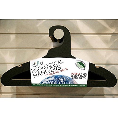Product Description What kind of hangers do you have in your closet? Ditto Ecological Hangers made by Green Heart Global are Tree-free, environmentally safe, not-toxic and 100% recyclable. The Ditto Ecological Paper Hangers replace the toxic, non-recyclable for consumers, retail and dry cleaning businesses. Strong and long lasting, the Ditto Paper Hanger can hold over 20lbs, strong enough to hold the heaviest leather jacket or winter coat. Ditto Paper Hangers can fit twice the amount of clothing in the same closet space! They are great for travel, kids camps or storing clothing. Three (3) Pack Quantities: 10 Pack, Case of 100 and Case of 12 x 10 Pack (120 hangers) Dimensions: Length: 17 in or 43 cm - 14 inch pants bar, and Strap notches Height: 9 in or 22.5 cm Thickness: 0.14 in or 3.5 mm Features: - The same heavy-duty, recyclable hangers used on the retail floors of major clothing companies around the world - 100% non-toxic, 100% recyclable in all paper recycling systems--can even be composted. - Fits 50% more clothing in small closet spaces - Non-tangling - Perfect for college dorms, traveling, vacations, cruises, summer camps and business trips - Write on them for organizing your clothing or seasonal storing - Certified to be lead, chlorine, formaldehyde, azo dye and heavy metal free - Uses only soy-based inks and starch-based adhesives Buy Ditto Hangers and help to keep 8 Billion toxic hangers from going into landfills every year. With your help, we're saving the planet one hangar at a time. Our award-winning and revolutionary hangers are manufactured from the world's most recycled materials, Recycled Paper. 0