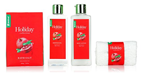 - 4PC BODY CARE GIFT SET FOR WOMEN: Each Pinkleaf Xmas gift set comes with 6.1 flz oz pomegranate & coconut oil body wash, 6.1 fl oz moisturizing lotion, 7.05 ounces of scented bath salts & a mini white washcloth towel.