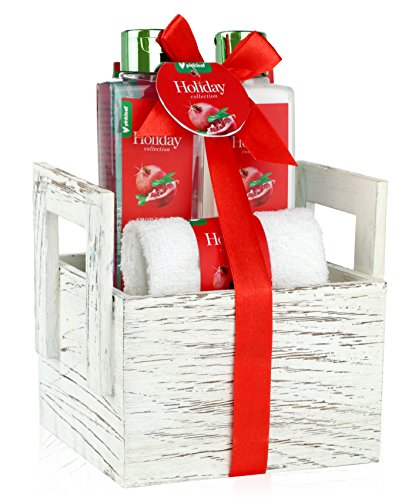 Pomegranate & Coconut Oil Holiday Spa Gift Basket, 4pc Scented Bath & Body Kit in Wooden Vanity Box – Luxury Shower Gel, Lotion, Salts, Soft Washcloth Towel