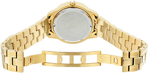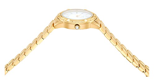-. Feature : Gold ion-plated watch featuring white mother-of-pearl dial with textured silver-tone border, diamond-accented bezel, and crystal-capped fluted crown / Swiss quartz movement with analog display / Flame Fusion crystal dial window / Features jewelry clasp closure, link bracelet, and silver-tone hour markers / Water resistant to 330 feet (100 M): suitable for snorkeling, as well as swimming, but not diving