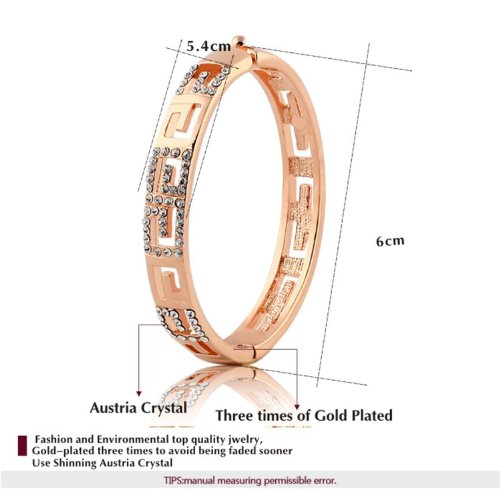 - Feature : The bracelet is composed of many letter "G" patterns some of which are covered with clear crystal shining beautifully. It's 18k rose gold plated. / A perfect accessory to your outfit or as an appropriate gift used in wedding and engagement party or other occasions. / The bracelet is about 2.4'' in diameter. / Shipped out in an exquisite jewelry gift box. Delivery time 7-15 days. / One year warranty to ensure you a perfect shopping experience.